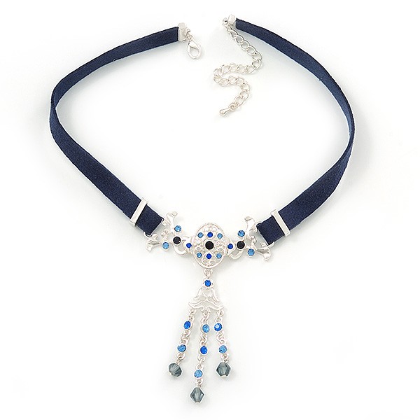 Victorian Dark Blue Suede Style Diamante Choker Necklace In Silver Tone Metal -