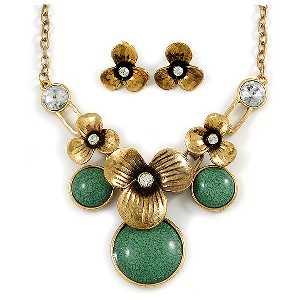 Burn Gold Diamante 'Flower' Necklace With Green Stones & Stud Earrings Set -
