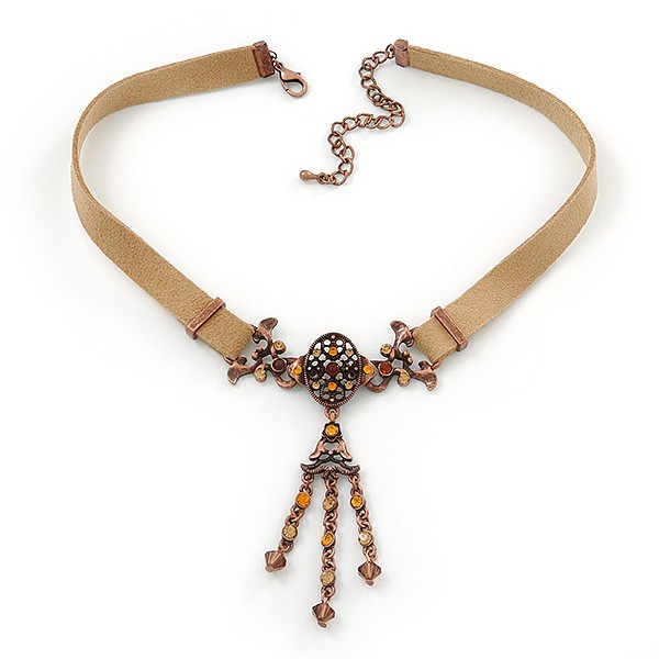 Victorian Light Brown Suede Style Diamante Choker Necklace In Bronze Metal -