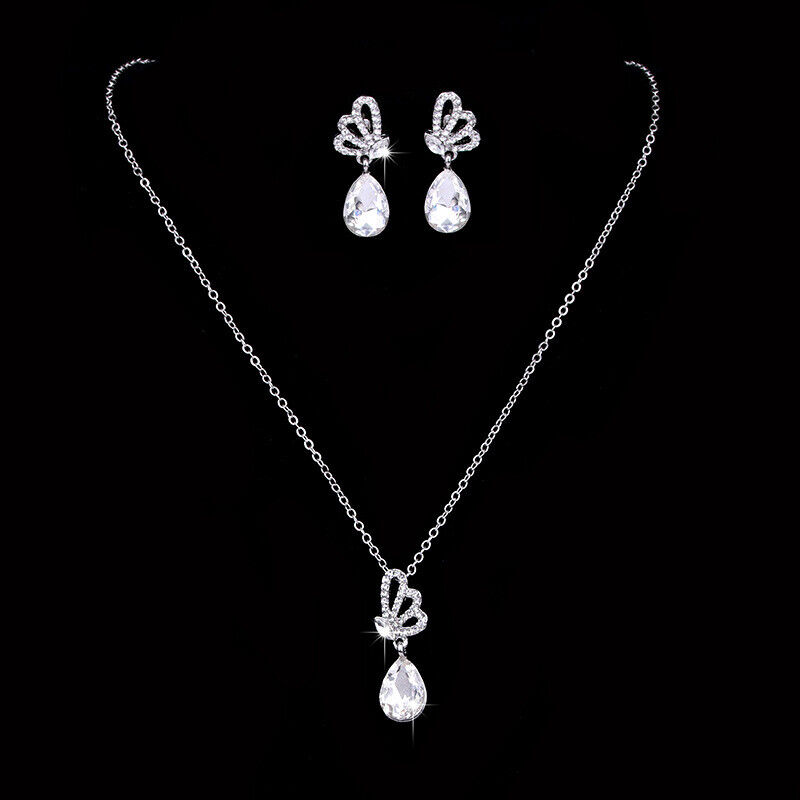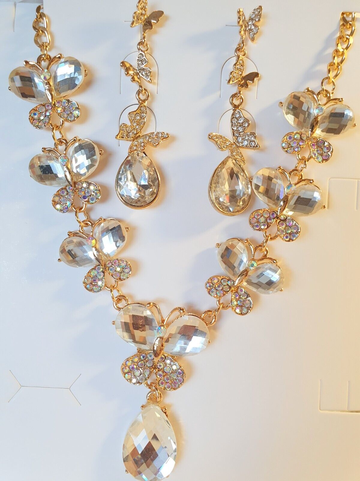 Crystal Diamante Butterfly Silver Necklace And Earrings Set Costume Jewellery