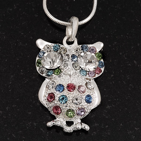 Wise Multicoloured Diamante Owl Pendant Necklace In Rhodium Plated Metal - 42cm