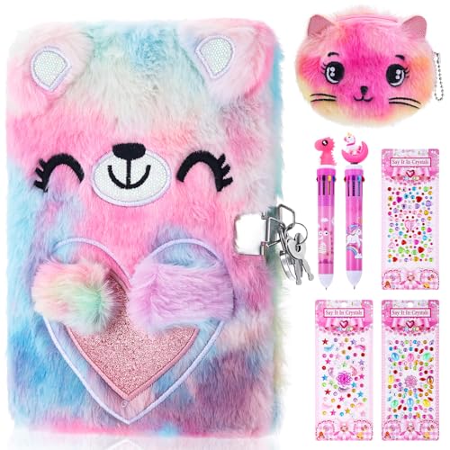 ICEBLUEOR Secret Diary with Lock for Girls, Plush Cat Journal Notebook Set with Unicorn Coin Purse/Pen/Bracelets/Crystal Heart Stickers, Cute Girls Birthday Gifts for Age at 6 7 8 9 10 Years Old
