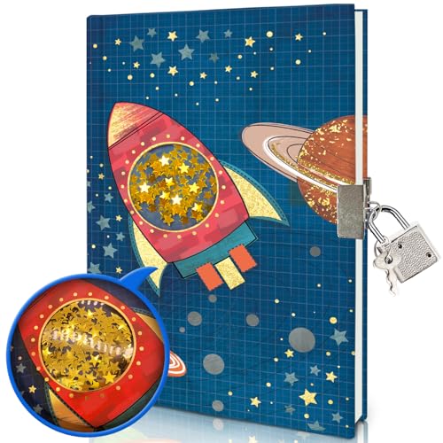 GINMLYDA Secret Diary with Lock for Boys, 7x5.25 Inches 160 Lined Pages Shakable Sequin Boy Diary Spacecraft Journal for Kids Notebook Boys Gifts for Birthday Presents Toys 5 6 7 8 9 10 Year Old