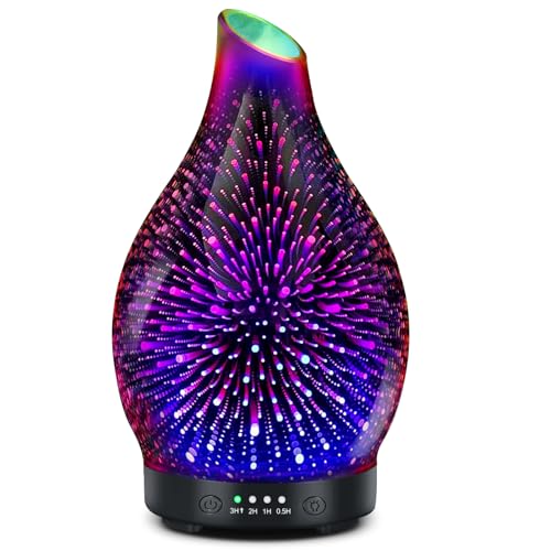 Essential Oil Diffuser -3D Firework Glass Aromatherapy Diffusers for Essential Oils with 4 Timer Setting Auto Shut-Off Silent Operation 7 Colors Lights Changing for Room, Office, Yoga