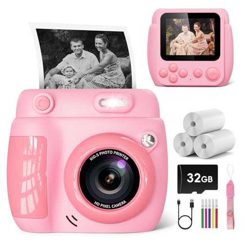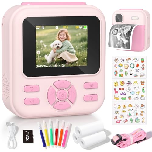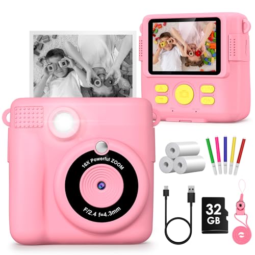 HiMont Kids Camera Instant Print, Digital Camera for Kids with No Ink Print Paper & 32G TF Card, Selfie Video Camera with Color Pens for DIY, Fun Gift for Girls Boys 3-14 Years Old (Pink)