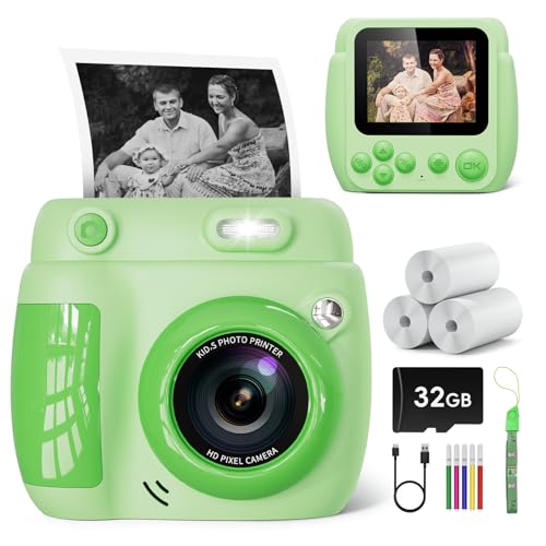HiMont Kids Camera Instant Print, Digital Camera for Kids with No Ink Print Paper & 32G TF Card, Selfie Video Camera with Color Pens for DIY, Fun Gift for Girls Boys 3-14 Years Old (Green)