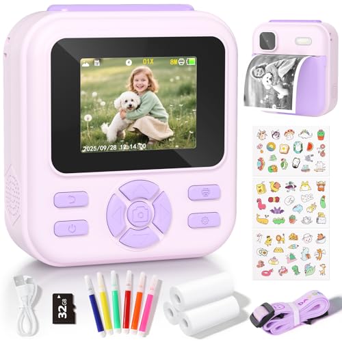 ETIKEZ Kids Camera, 1080P Instant Digital Print Camera for Kids, Christmas Birthday Gifts for 4 5 6 7 8 9 10 Year Old Girls Boys, Portable Toy with 32GB SD Card & 3 Rolls Printing Paper, Purple