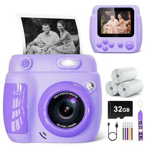 Gofunly Kids Camera Instant Print, 1080P Digital Camera for Kids with 32GB Card & 5 Print Paper Rolls, Selfie Toy Gift for Girls & Boys Ages 3-12, Purple