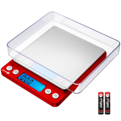 Criacr Digital Cooking Scales, (500g/ 0.01g) High-Precision Kitchen Scales, Stainless Steel Jewelry Scales with Back-Lit LCD Display, Two Trays, Tare and PCS Features, Batteries Included (Red)