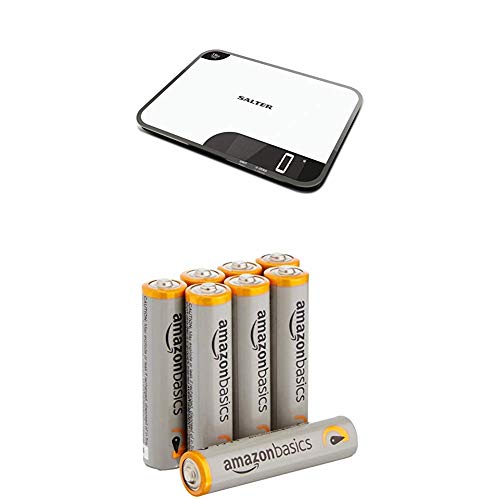 Salter Max Chopping Board Digital Kitchen Weighing Scales – Extra Large Glass Platform Design Electronic Cooking Scale Appliance for Home and Kitchen, Weigh and Chop Food up to 15kg, 15 Year Guarantee – White with Amazon Basics Batteries