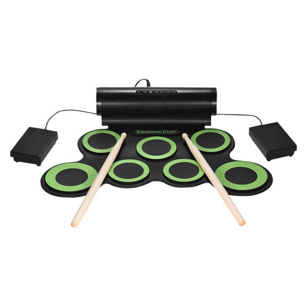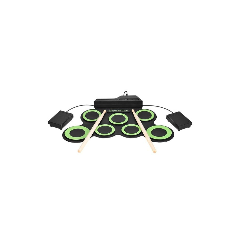 Portable Electronic Digital USB 7 Pads Roll up Set Silicone Green Electric Drum Kit with Drumsticks and Sustain Pedal