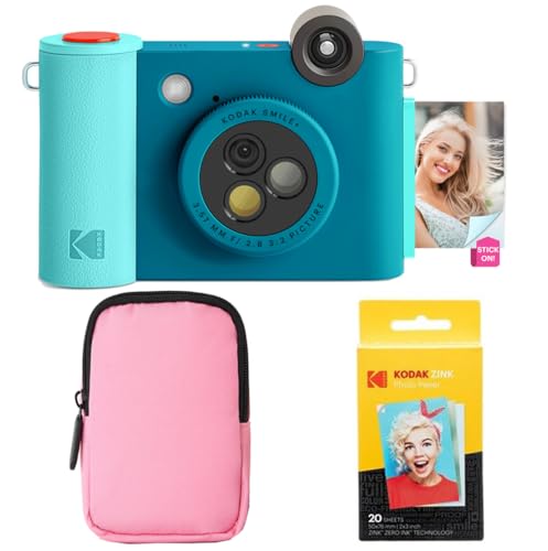 KODAK Smile+ 2-in-1 Digital Instant Camera & Photo Printer Starter Bundle - Deluxe Case + Zink 20pk Paper - 10MP, Rotating Lens - Blue