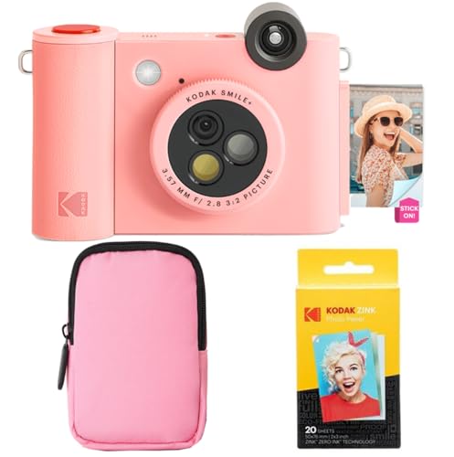 KODAK Smile+ 2-in-1 Digital Instant Camera & Photo Printer Starter Bundle - Deluxe Case + Zink 20pk Paper - 10MP, Rotating Lens - Pink