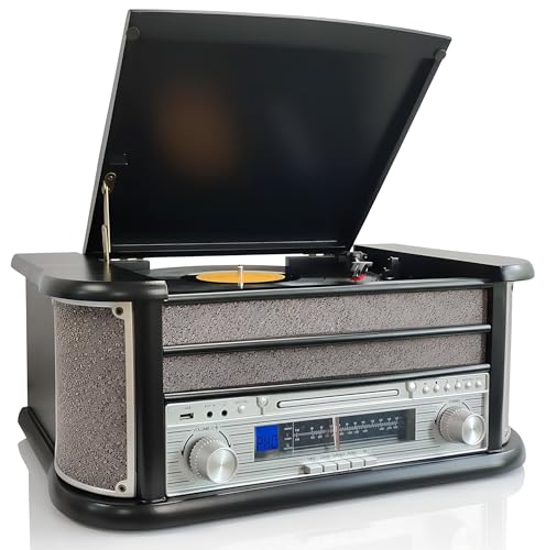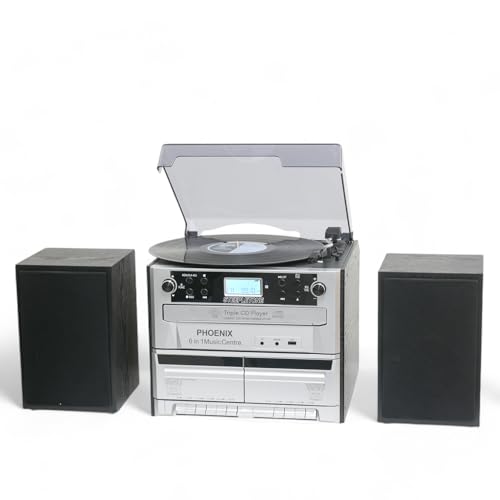 Steepletone PHOENIX 6 in 1 Music Centre High Speaker Volume, Triple CD Player, Vinyl Record Player, Twin Cassette, FM Radio and Bluetooth, MP3 playback Encoding, Remote Control, Stereo Speakers