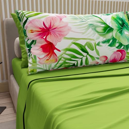 PETTI Artigiani Italiani - Cotton Sheets with Pillowcases in Digital Print, French Queen, Top and Bottom Sheet Set with Corners, Flamingo Green, 100% Made in Italy