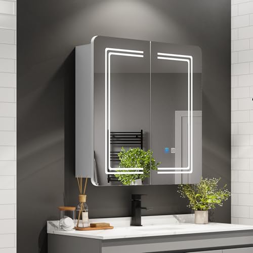 ELEGANT Illuminated Bathroom Mirror Cabinet with LED Lights, Stainless Steel Wall Mounted Mirror Cupboard with Demister Pad Shaver Socket & Sensor Dimmer Switch 650 x 600mm