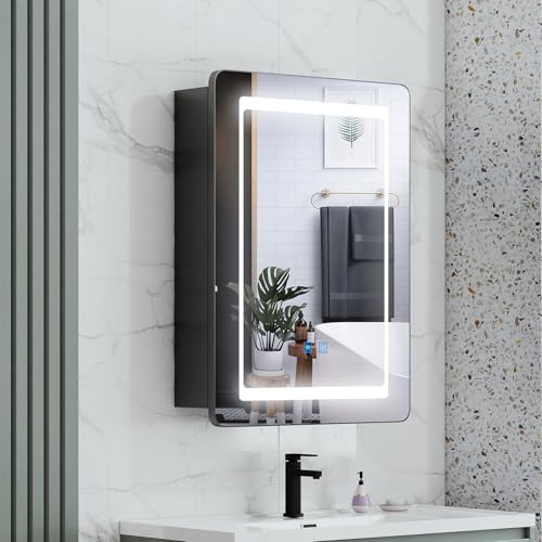 LUMIRRORS® Bathroom Mirror Cabinets with LED Lights and Shaver Socket 50x70cm, Wall Mounted Bathroom Cabinet with 3 Colour Lighting, Anti Fog, Dimmer, Touch Switch, Glass Shelves, IP44, Matt Black