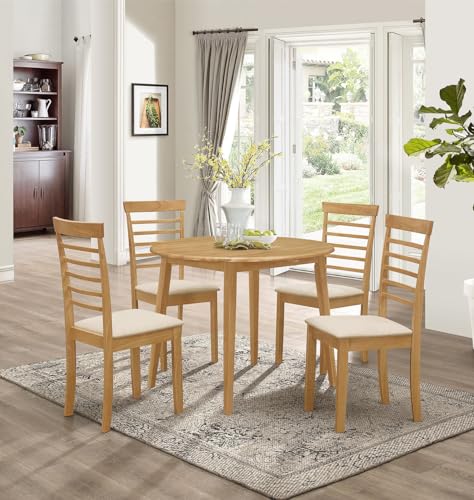 Hallowood Furniture Ledbury Small Dining Table and Chairs Set 4, Round Wooden Drop Leaf Table and Cream Fabric Ladder Back Padded Chairs, Extendable Dining Room Sets in Light Oak Finish