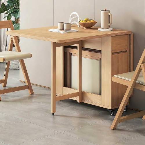 Wooden Folding Dining Table, Dining Room Furniture Sets with 4 Foldable Chairs & Drawers & Wheels, Solid Wood Table for Apartment, Breakfast Nook or Studio