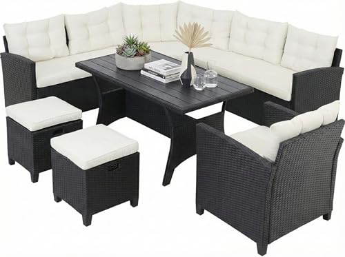 CASARIA® Premium Poly Rattan Garden Furniture | WPC Dining Table & Chairs Set | Outdoor Patio Conservatory Corner Sofa | Wicker Lounge Bench Seating | 9 Seater | Black With Cream Cushions
