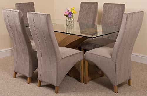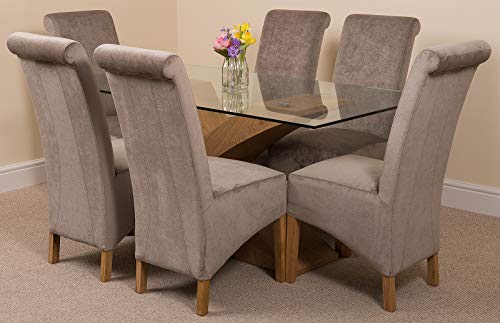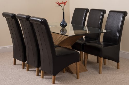 Valencia Oak Cross Leg 160 x 90 cm Glass Dining Table and Chairs Set 6 with Lola Black Fabric Chairs