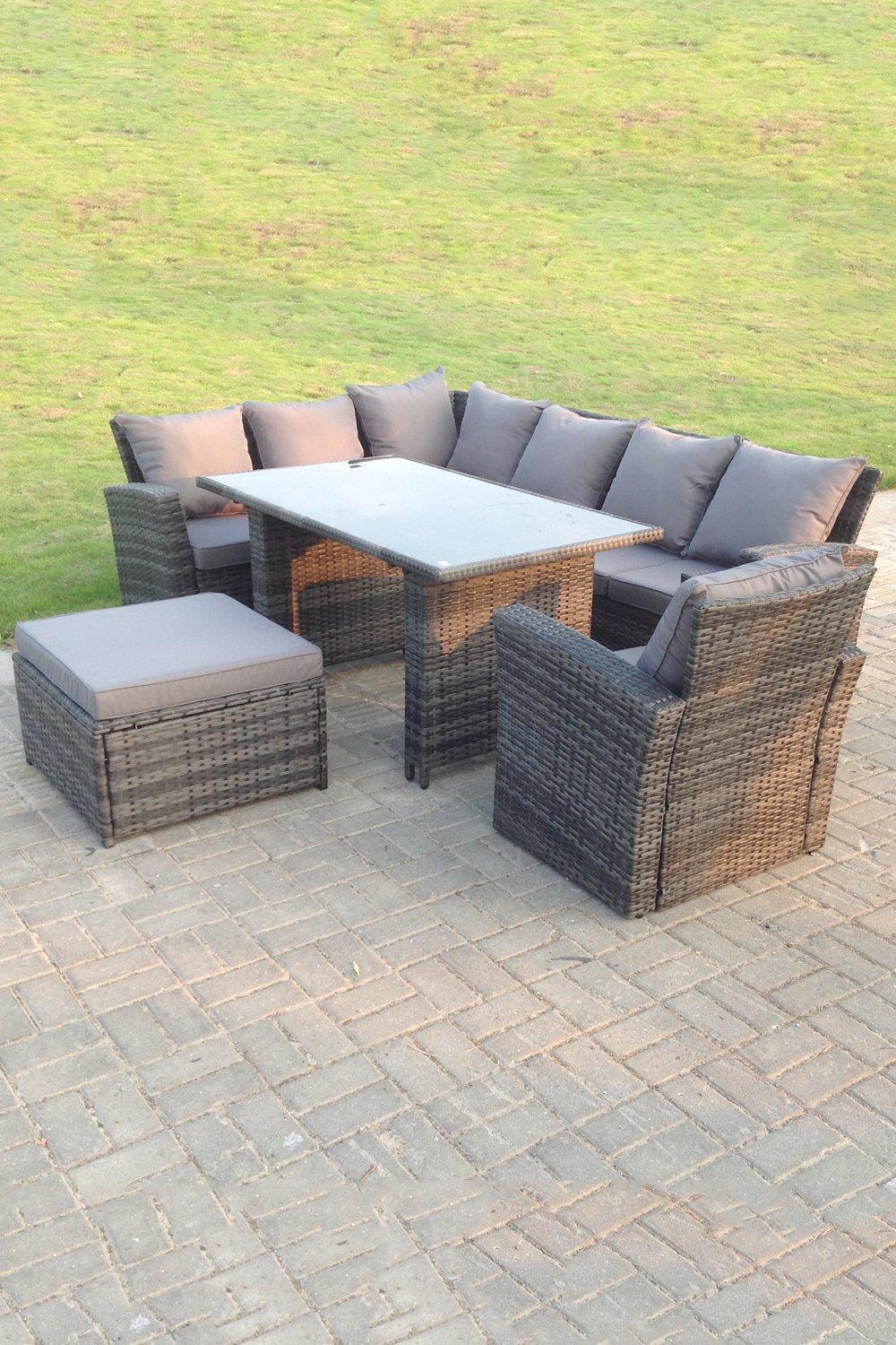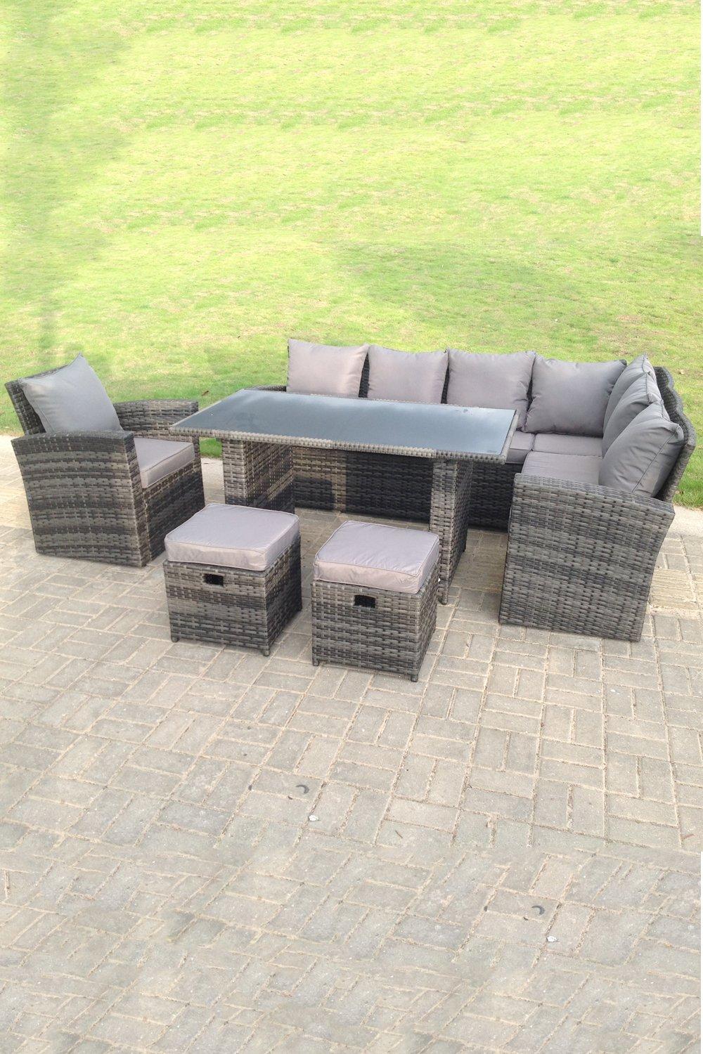 8 Seater High Back Rattan Set Corner Sofa With Oblong Dining Table Footstool With Arm Chair