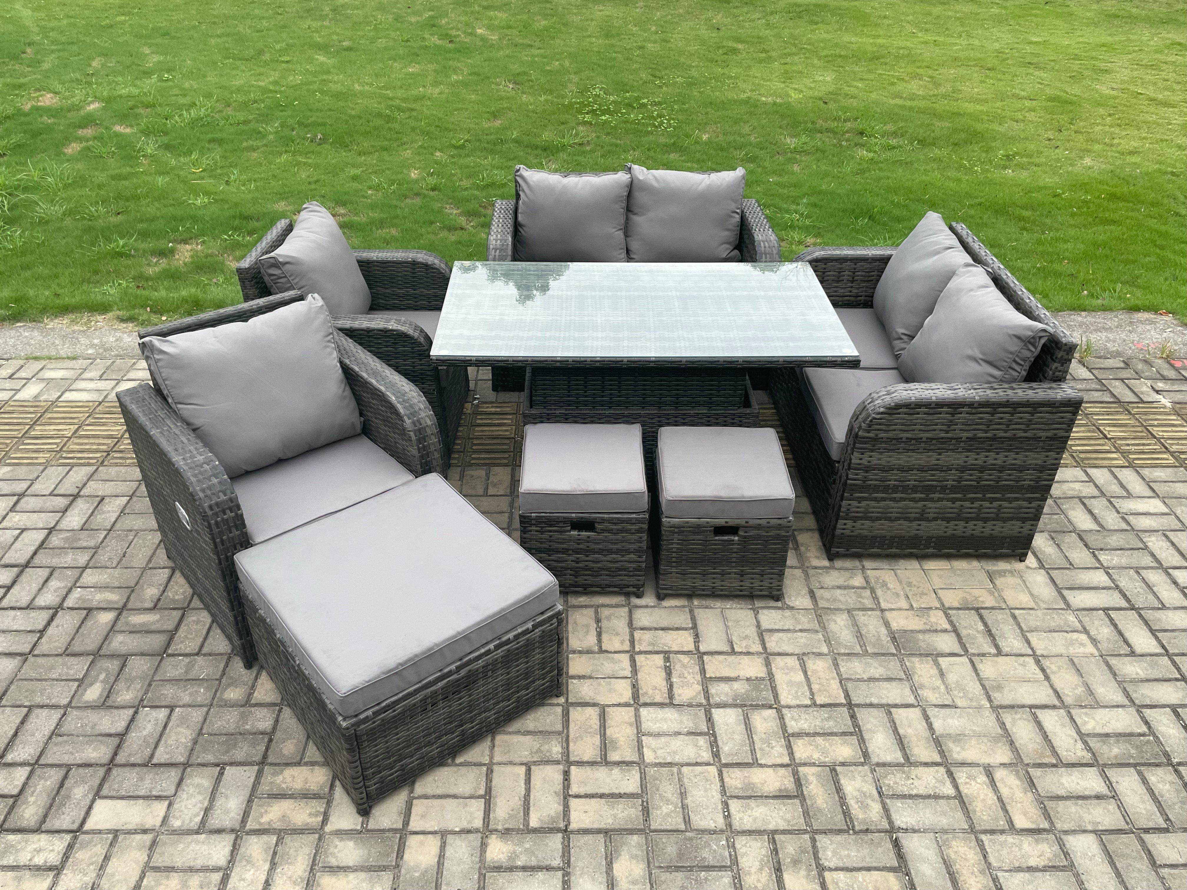 Lounge Sofa Garden Furniture Set Rattan Rectangular Dining Table Patio Chair with 2 Small Footstool 9 Seater