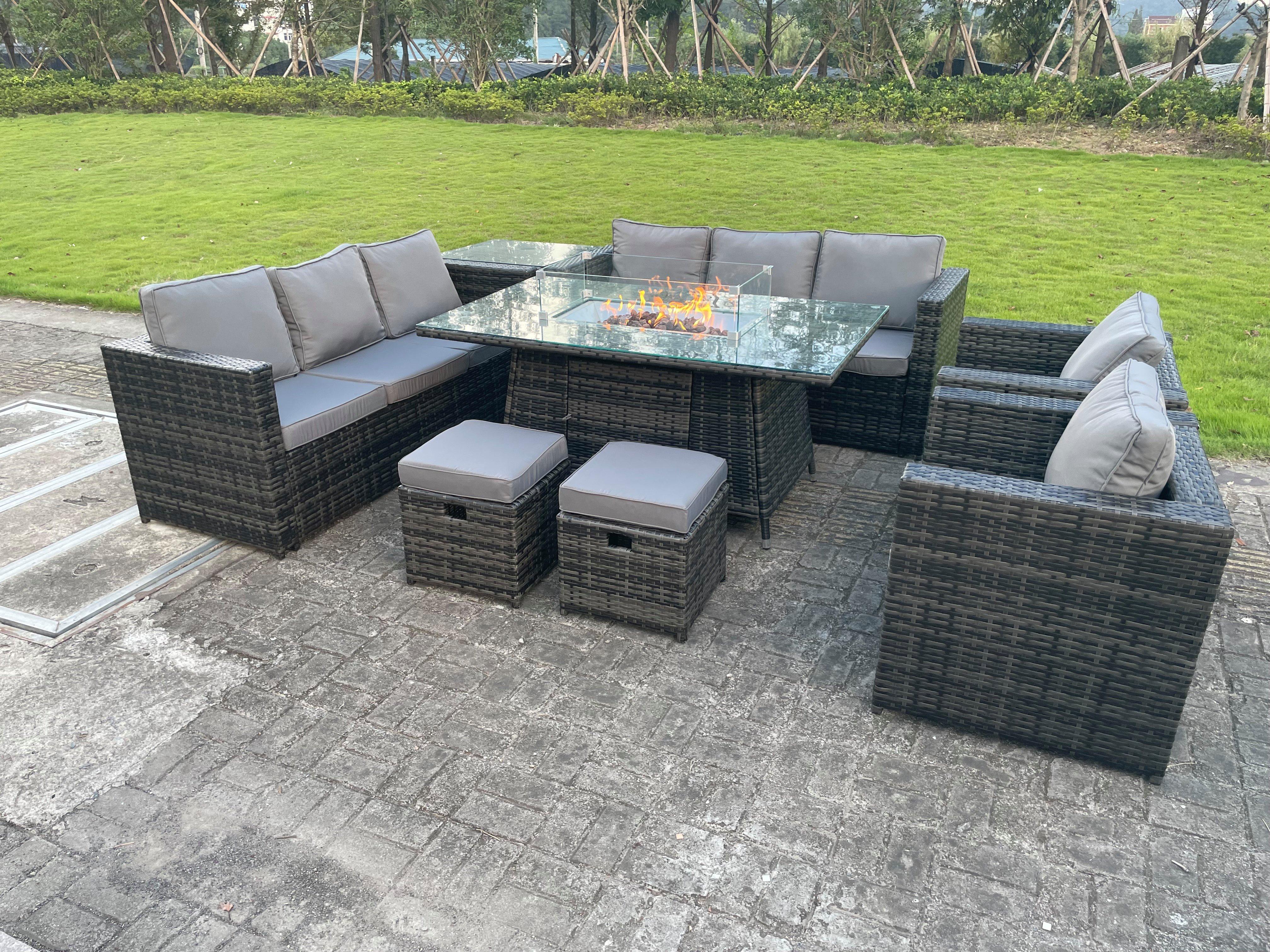 9 Seater Outdoor Garden Dining Sets Rattan Furniture Gas Fire Pit Dining Table Gas Heater with Chair 2 Footstools