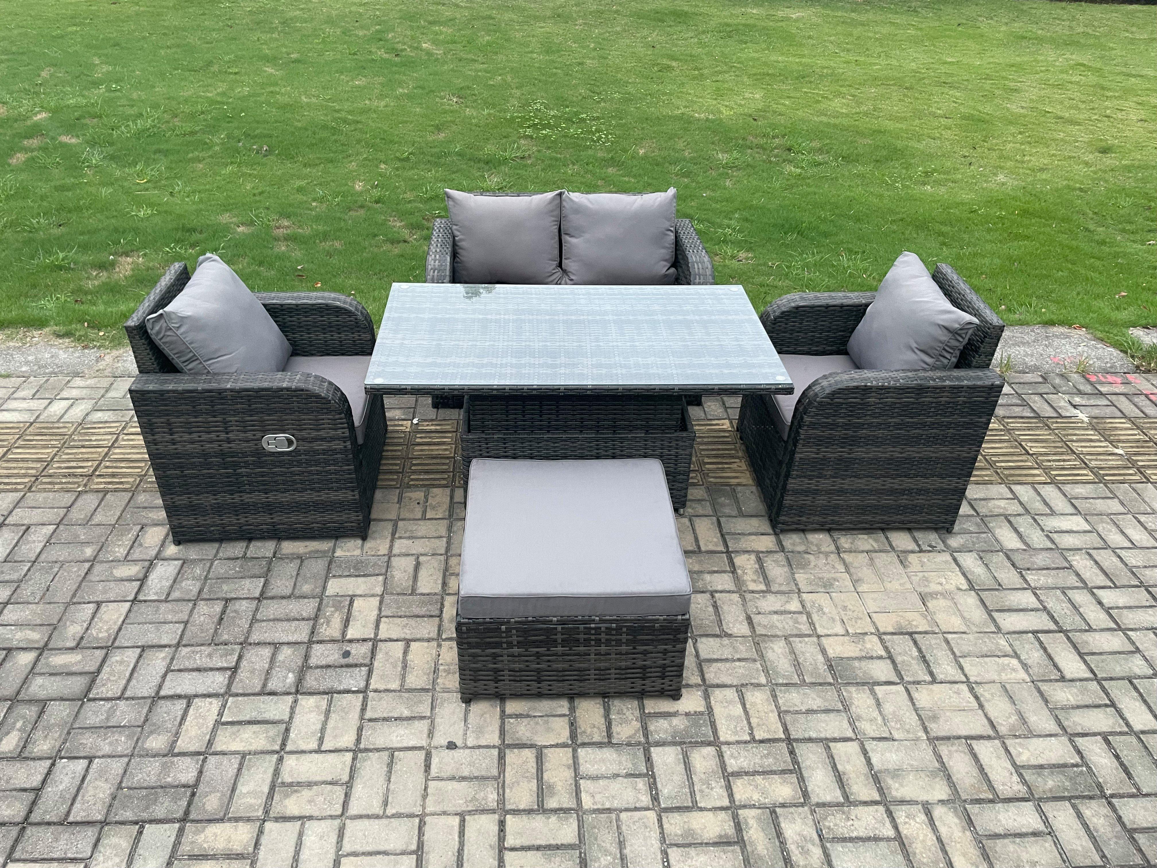 PE Rattan Garden Furniture Set Height Adjustable Rising lifting Dining Table With Love Sofa Chair 3 Footstools