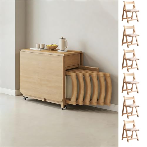 Dining Table Set for 4-6, Solid wooden Folding Table And Chairs with Storage and Wheels, Saving Spac Extendable Folding Dining for Compact Apartment(1 * 6 tables set)