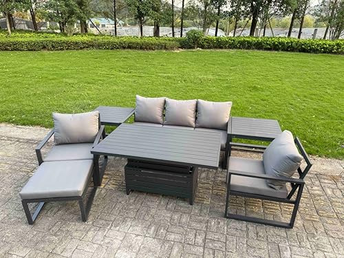 FMSGarden 7-Piece Aluminium Garden Furniture Sets 6 Seater Outdoor Sofa Set with Adjustable Rising Lifting Dining Table 2 Chairs Big Footstool 2 Side Tables
