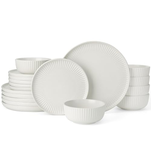 Starlight Dinner Sets for 6 People, 18 Pieces Reactive Glaze Plates and Bowls Sets, Embossed Stoneware Dinner Sets, Scratch Resistant Dinnerware Set, Dishwasher & Microwave Safe, MatteWhite