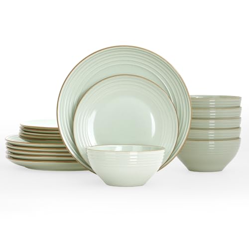 Jupiter Plates and Bowls Set, Reactive Glaze Dinner Sets for 6 People, 18 Pieces Stoneware with Gold Rim, Scratch Resistant Dinnerware Service for 6, Microwave & Dishwasher Safe, Light Green