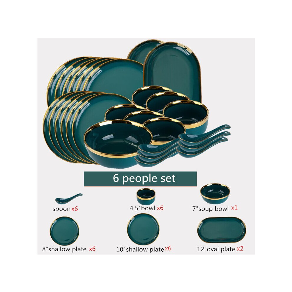 (a-6 people set(27pcs)) Gilt Rim Green Ceramic Plate Steak Food Plate Tableware Bowl Ins Dinner Dish High End Porcelain Dinnerware Set For Family Hote