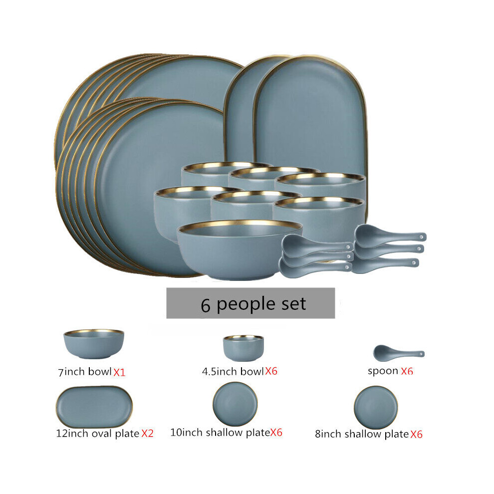 (a-6 people set) Matte Gilt Rim Ceramic Tableware Set with Spoon Cereals Bowl Dessert Plate Steak Plate for Dinner Gift Plates and Bowls Set