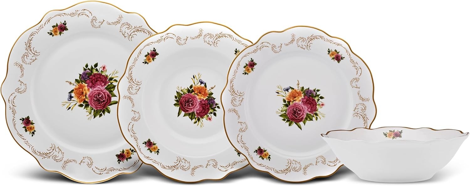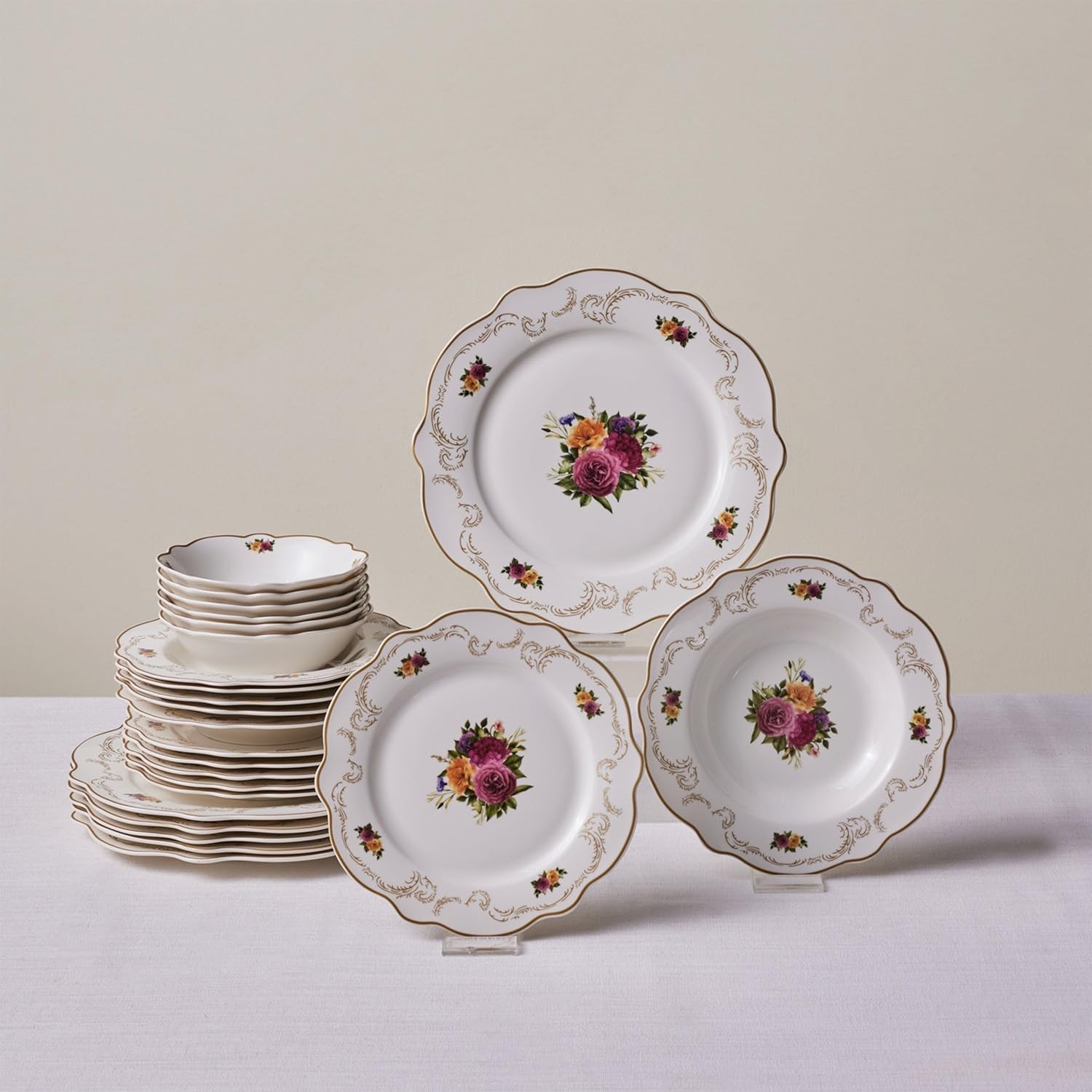 Karaca Antique Plates and Bowls Set for 6 People, White Dinner Set, Complete Kitchen Tableware Collection, Colourful Flower Design, Bone China, 24 Piece