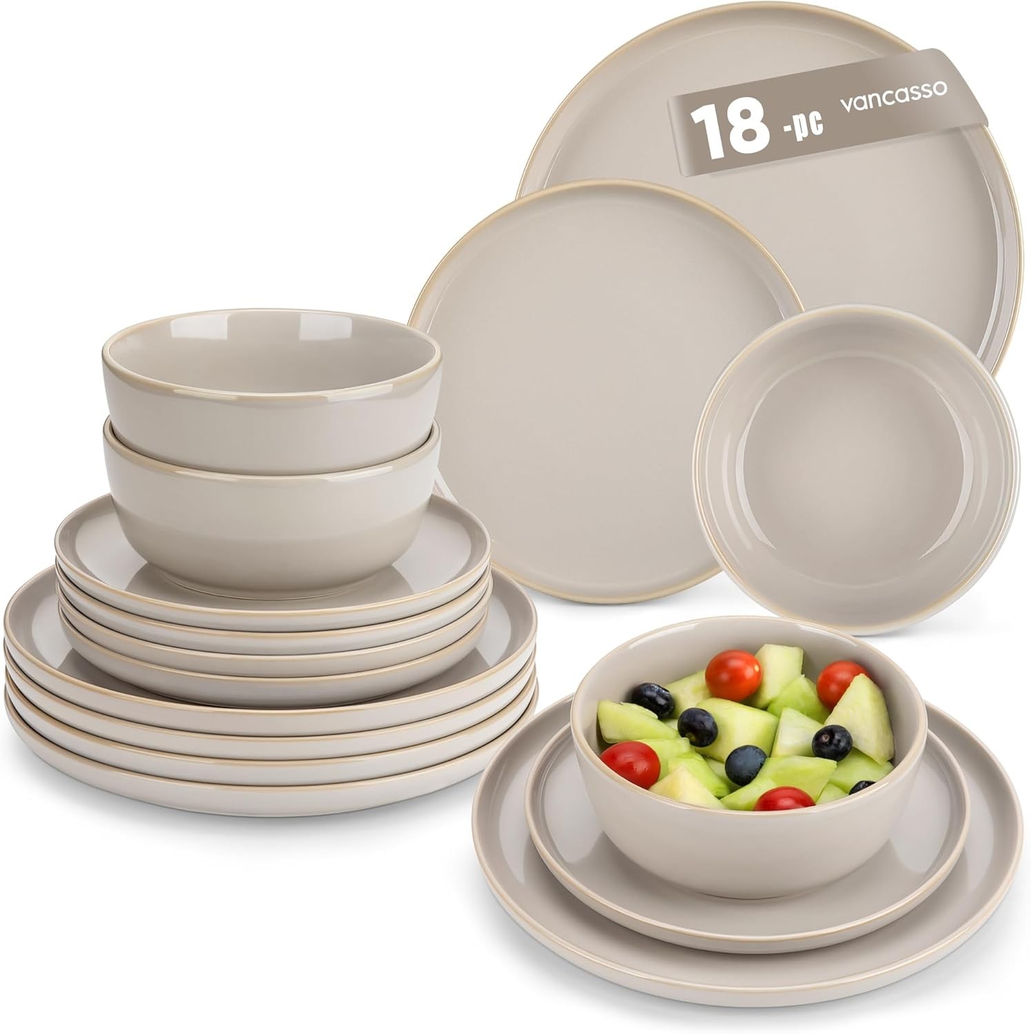vancasso ANYA Crockery Set, 18 Piece Dinner Sets for 6 People, Include Ceramic Dinner Plates, Dessert Plates, and Cereal Bowls, Dishwasher and Microwave Safe, Caramel