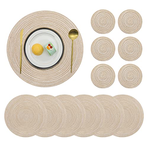 Pauwer Woven Table Placemats and Coaster sets 6, Round Cotton Dinner Table Mats Anti Slip Heat Resistant Place Mats Easy Clean