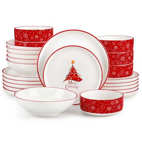 MALACASA 24-Piece Christmas Tree Plates and Bowls Set for 6, Ceramic Dinner Sets with Dinner Plates/Dessert Plates/Soup Bowls/Cereal Bowls, Holiday Crockery Set Dining Set Tableware for Entertaining