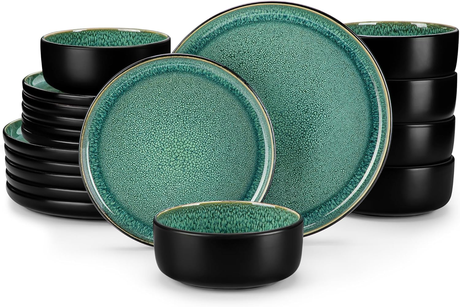 vancasso Bubble Green Dinner Set, 24 Pieces Dinner Sets for 6 People, Reactive Glaze Plates and Bowls Set in Vintage Look, Include Dinner Plates, Dessert Plates, Pasta Bowls and Soup Bowl