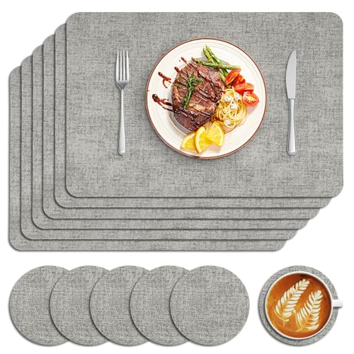 Sarsumir Placemats, Placemats and Coaster Sets 6 Place Mats and 6 Coasters PU Leather Dining Table Mats Washable Heat Resistant Non-Slip for Home Restaurant Dinner Party, Silver Gray