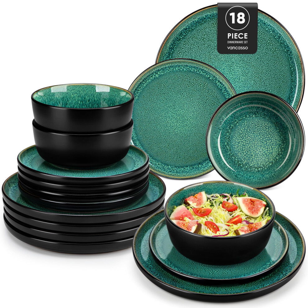 vancasso Playa Green Dinner Set, Reactive Glaze Dinner Sets for 6 People, 18-Piece Mediterranean Crockery Set with Dinner Plates, Dessert Plate and Cereal Bowls