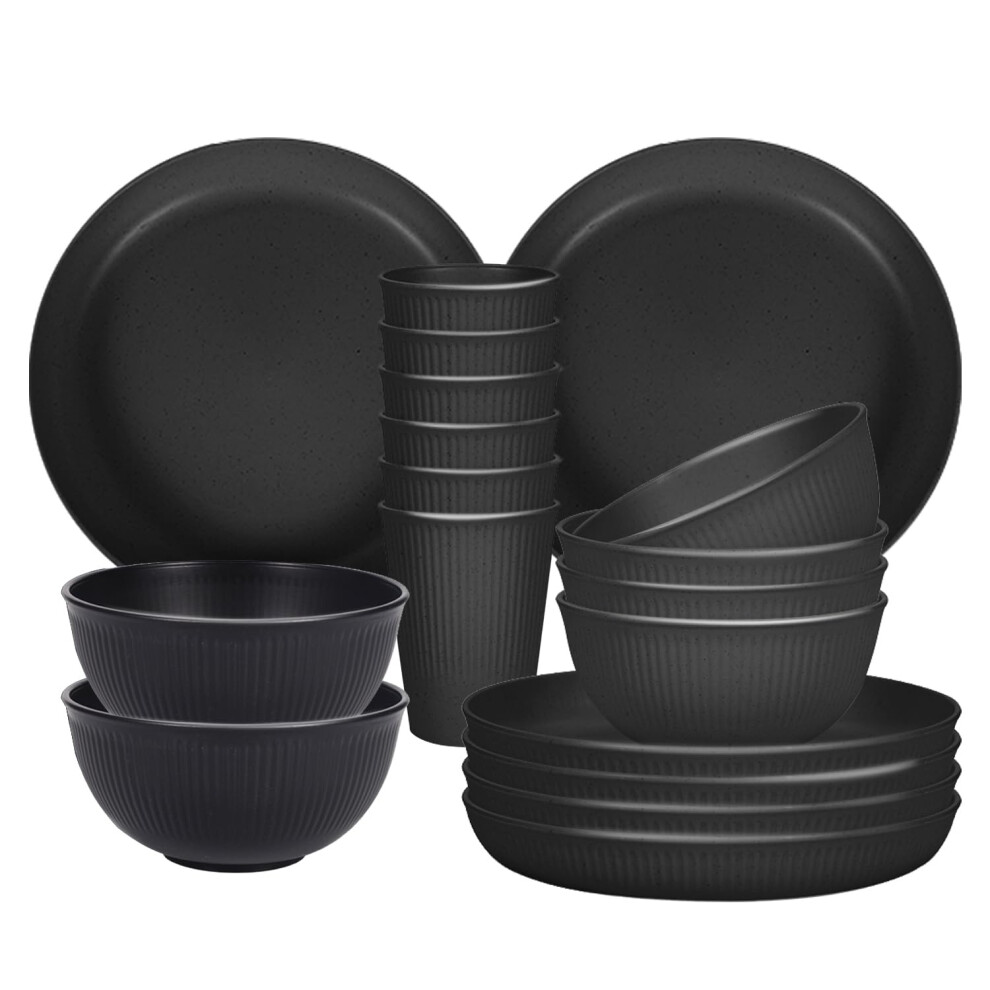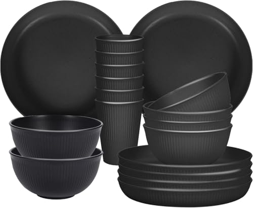 Camping Plates, Unbreakable Dinner Sets for 6, 18 Pcs Plastic Picnic Set for Party, Home & Picnic, Lightweight Microwave & Dishwasher Safe Camping Cutlery for Kids and Elderly (Black)