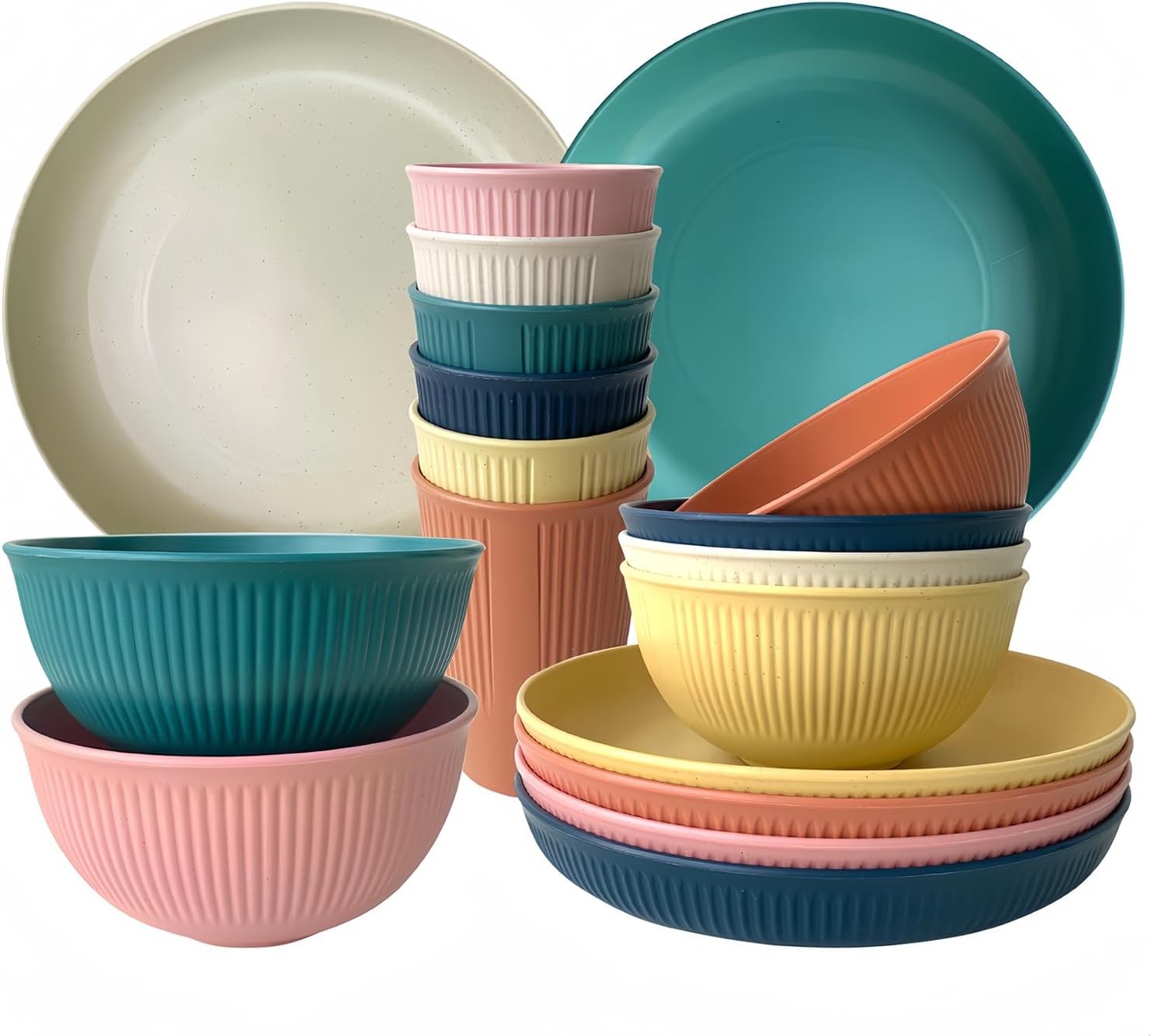 Camping Plates, Unbreakable Dinner Sets for 6, 18 Pcs Plastic Picnic Set for Party, Home & Picnic, Lightweight Microwave & Dishwasher Safe Camping Cu