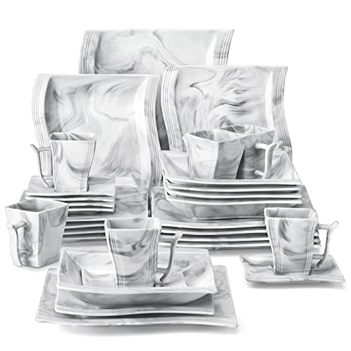 MALACASA Dinner Sets for 6 People, 30-Piece Porcelain Square Plate and Bowls Set Marble Grey Dinnerware Set Tableware with Dinner Plates/Dessert Plates/Soup Plates/Cups and Saucers, Series Flora