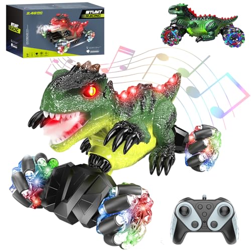 Dinosaur Remote Control Cars - 8WD 2.4Ghz RC Car for 4 5 6 7 8 Year Old Boys, Transform Features RC Stunt Car with 360° Rotating/Spray/Light/Roar, Birthday Xmas Gifts for Kids Age 4-6 5-7 8-12 (Green)