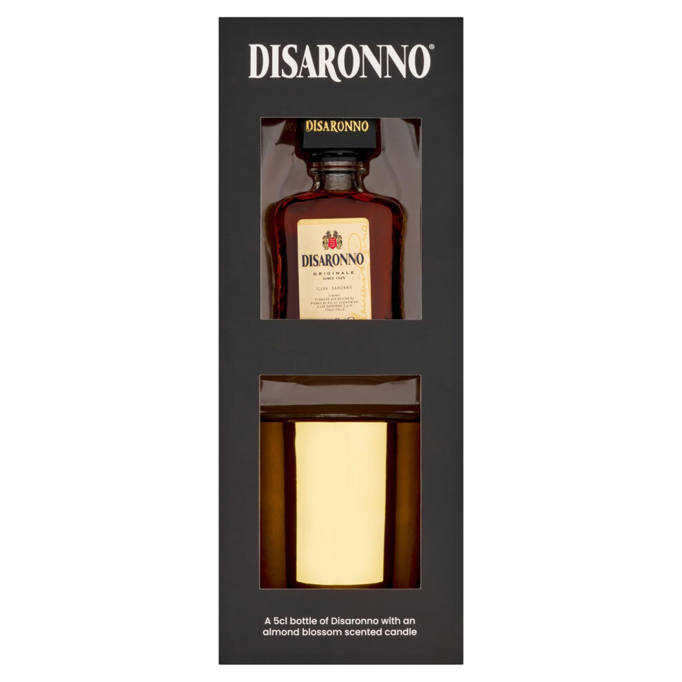 Disaronno Liqueur & Candle Gift Set, including Originale Liqueur 5cl and an Almond Blossom scented candle. Perfect for Christmas and Birthdays.