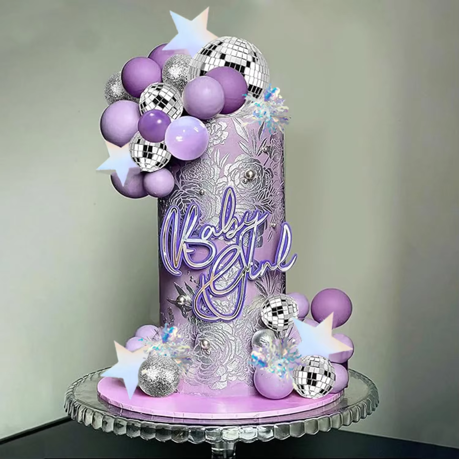 Purple Disco Ball Mirror Balls Cake Decorations with Silver Stars Cake Topper fo