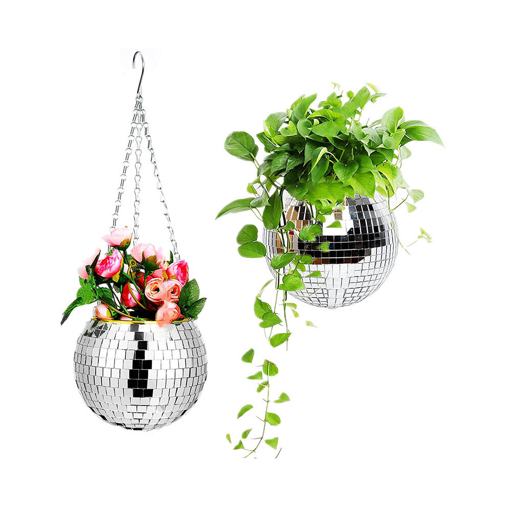moonoom 2 Pcs Sliver Disco Ball Planter with Chain,Home Boho Hanging Planter,4Inch Hanging Mirror Ball Flower Pots for Indoor Outdoor Plants