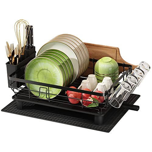 Dish Drainer Rack, Stainless Steel Dish Rack, Draining Board Rack with Swivel Drainage Spout, Dish Drying Rack with Utensil Holder, Cup Holder and Drying Mat, Black